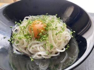 ③ 細うどんを①に加えて和え、器によそり小口切りのこねぎ、ごま、卵黄をのせる