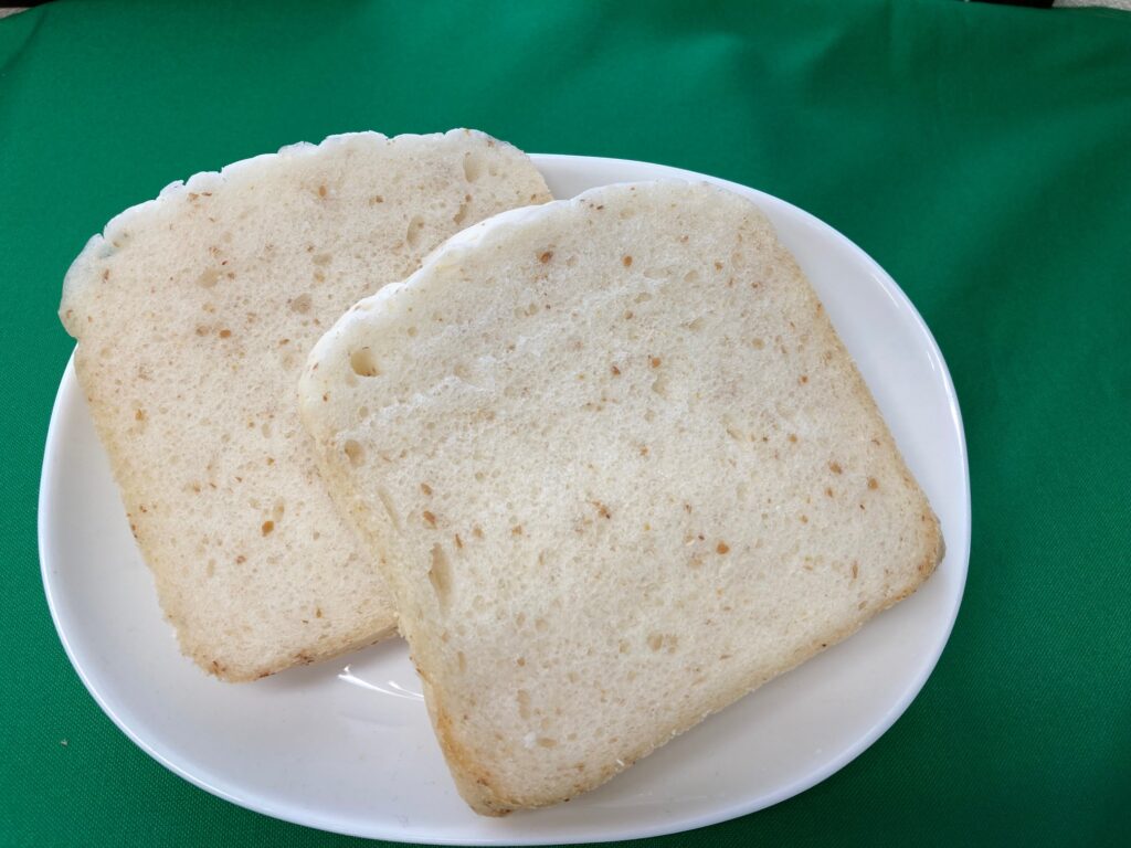 A)でんぷんパンミックスを焼いて粗熱がとれたら、1食分ずつスライスしてラップに包んでおきます。翌日以降は少しポロポロしますので、フライパン焼いたり、ラップに包んだまま電子レンジ600Wで20秒温め直すとフワフワになります。